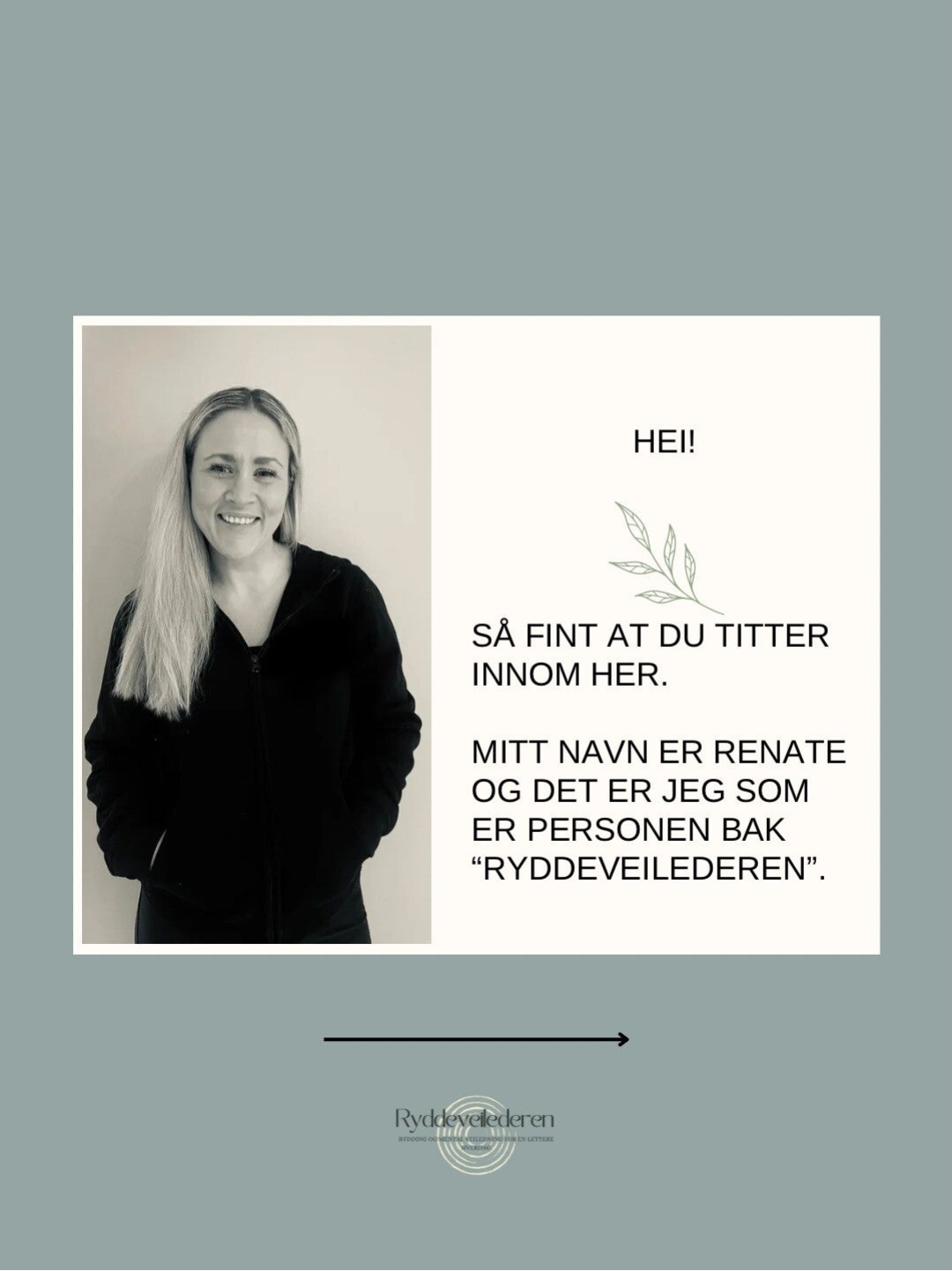 Bli kjent med meg og min lidenskap for rydding og livsmestring. Jeg er her for å hjelpe deg med å skape orden og ro i hverdagen. Med en bakgrunn som sosionom og erfaring innen veiledning, tilbyr jeg en unik tilnærming til rydding, organisering og det som ligger bak.